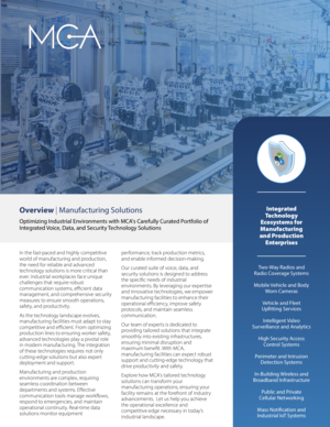 Industry 4.0 is revolutionizing the way companies manufacture and distribute their products. MCA is at the forefront of technologies such as the Internet of Things (IoT), artificial intelligence (AI), and machine learning that will help your business grow and prosper. Our communication, data, security, and equipment and personnel solutions will solve your most pressing problems. With MCA, your manufacturing business will hum like the well-oiled machines it houses.